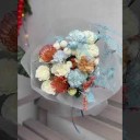 - Голубые диантусы добавляют небесный оттенок, делают композицию более свежей и современной; рядом с ними белые кустовые хризантемы образуют мягкий контраст и придают букету визуальную плотность.